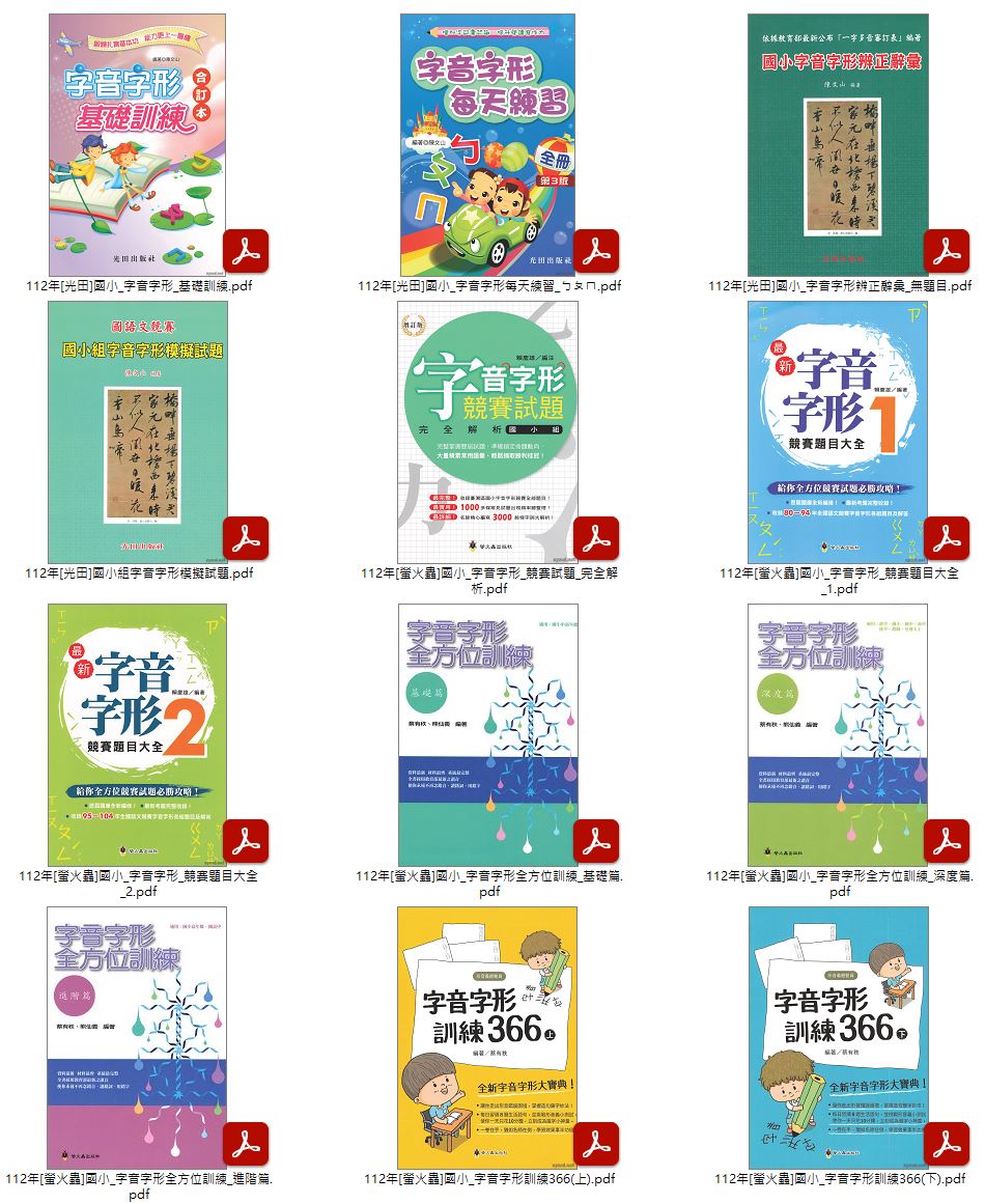 112年國小輔助教材 [螢火蟲]字音字形競賽試題 完全解析 + 字音字形競賽題目大全(1、2) + 字音字形全方位訓練(基礎篇、深度篇、進階篇) + 字音字形訓練366(上、下) + [光田]字音字形 基礎訓練 + 字音字形每天練習_ㄅㄆㄇ + 字音字形辨正辭彙 無題目 + 字音字形模擬試題 教材光碟