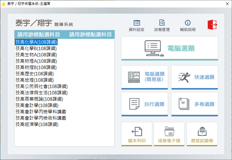 112學年上學期 技術高中命題光碟 泰宇版 化學+生物+物理+歷史+地理+公民與社會+法律與生活+商業概論+會計學+經濟學(108課綱)題庫光碟